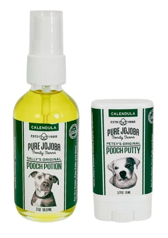 Meet the Pure Jojoba Pet Duo – Pooch Potion for silky smooth nourishment and Pooch Putty for soothing, protective care. Made with the same organic Pure Jojoba we trust on our own skin. This duo keeps noses kissable, paws cuddle-ready, and hot spots calm.